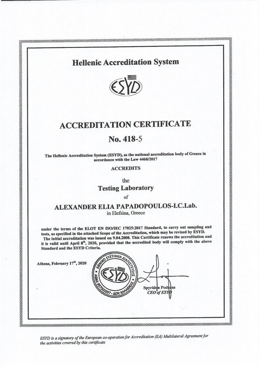 Accredited from ESYD in ELOT ΕΝ ISO/IEC 17025:2005, with No: 418-4.