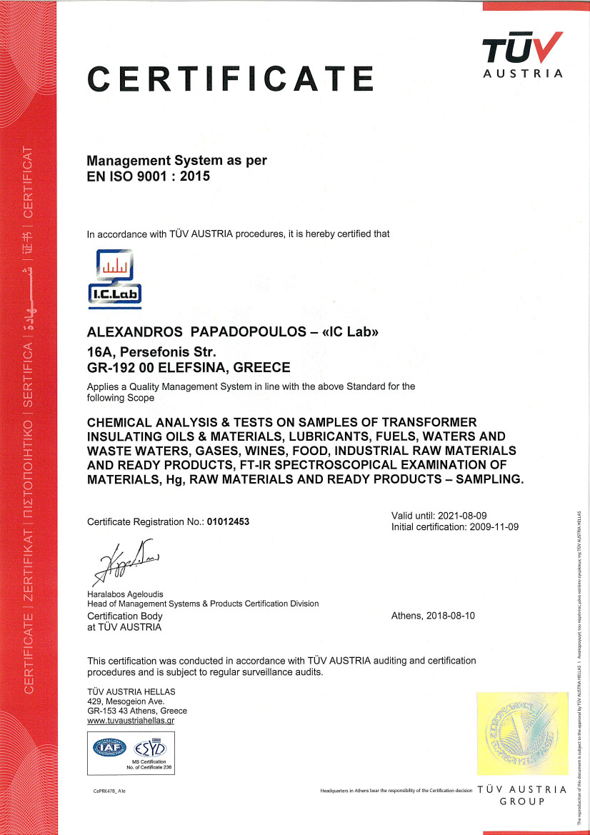 Our laboratory is Certified from TUV CERT, in EN ISO 9001-2015, with No: 01012453, and